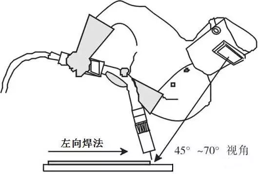 除对焊缝成形有影响之外,焊接方向与行走角对焊工熔池观察效果、飞溅的大小及气体保护效果也有一定的影响。左向焊时,操作者的视线从焊接电弧一侧呈45°~70°视角观察焊接电弧和焊接熔池,这种角度易于观察焊丝伸出端部的熔化情况及熔池变化情况;右向焊时,焊枪阻挡了操作者的视线,操作困难。图4为左向焊(平焊位)操作者视角示意图。