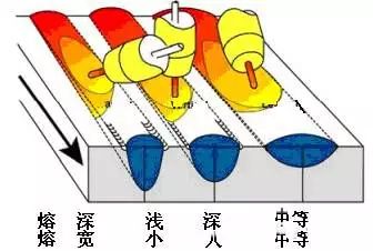 焊接方向与角度不同时,电弧与焊件作用方式有所不同,右向焊时电弧大部分直接作用在焊件上,而左向焊时电弧大部分作用在液态熔池上,因此在相同的焊接电流、电弧电压、焊接速度条件下,得到的焊缝宽度与熔深就不同,图3为焊接方向与角度及其焊缝成形影响示意图。