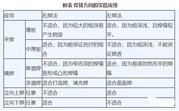 由于焊接方向与角度对焊缝成形、飞溅大小、气体保护效果等有重要影响,因此在实际焊接生产中,根据不同的技术要求及实际情况,左向焊与右向焊也就有不同的适用场合,典型焊接方向的实践应用见附表。
