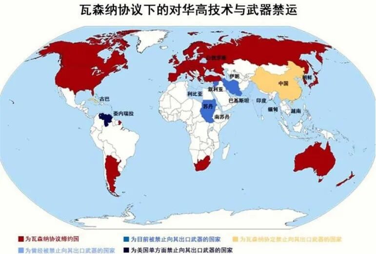 说到这里,就要提到1996年签署的《瓦森纳协定》。瓦森纳协定本名叫“瓦森纳安排机制”。简单来说就是:美国带着他的小伙伴不把东西卖给别的国家。我不知道都有哪些国家被“安排”了。反正中国是被安排得明明白白的。