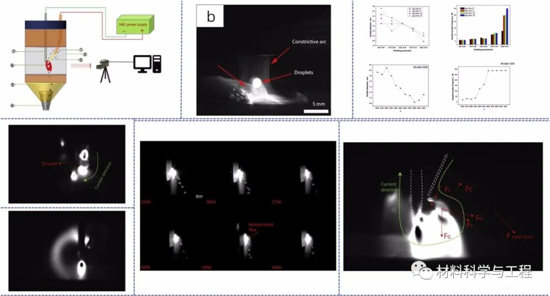 2、基于视觉传感方法揭示了强制拘束电弧增材制造电弧、熔滴产生过程的重要物理机制针对焊枪的封闭性结构,设计并加工了带有高温玻璃的水冷铜喷嘴,借助于高速摄像机探索了在不同电参数及保护气流量参数下的电弧及熔滴过渡行为规律,揭示了电参数及保护气参数对电弧及熔滴过渡的影响机制。研究成果以“Investigating the generationprocess of molten droplets and arc plasma in the confined space duringcompulsively constricted WAAM”为题于2020年1月发表在材料加工领域期刊