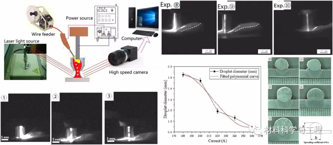 3、阐明了强制拘束电弧增材制造技术电弧形态、熔滴过渡及液态熔池动态行为规律基于高速摄像视觉检测方法,揭示了不同焊接参数下的电弧形态、熔滴过渡及液态熔池动态行为与交互作用,发现等离子体形态主要由枪体内部压力与其体积决定,熔滴过渡方式由射滴过渡转变为射流过渡,熔滴尺寸降低到最小 0.89 mm,建立了熔滴尺寸与电参数之间曲线和预测公式。研究成果以“Investigationon arc plasma, droplet, and molten pool behaviours in compulsively constrictedWAAM“为题于2020年4月在线发表在增材制造领域权威期刊