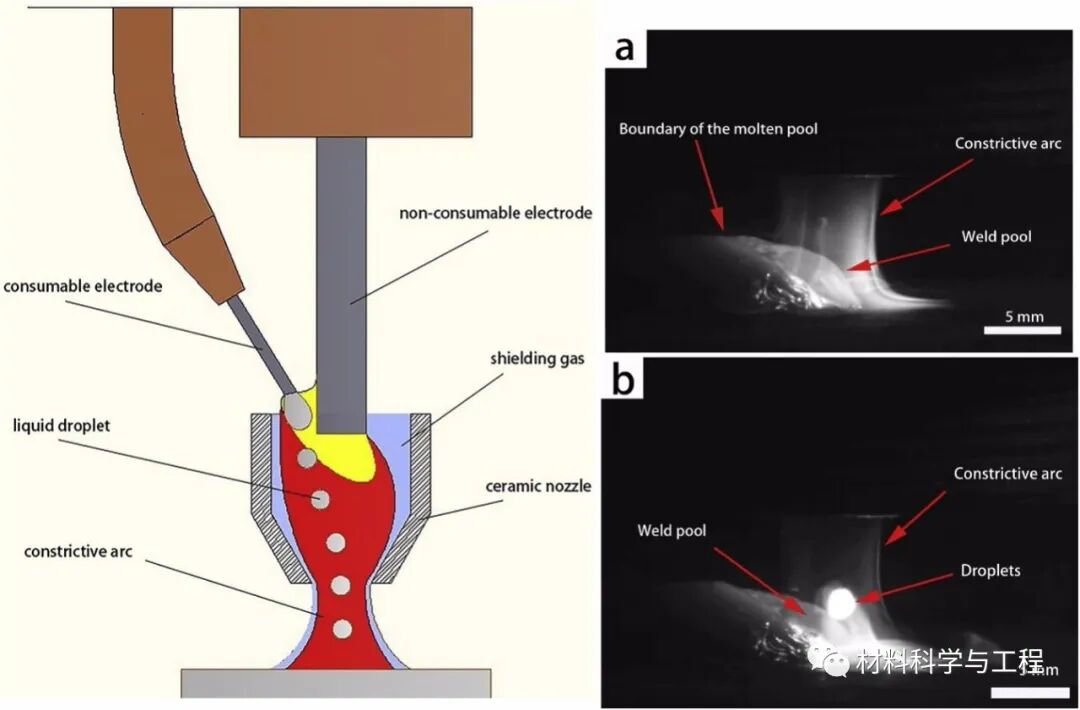 山东大学材料学院贾传宝团队长期致力于极端条件下的电弧加工物理过程检测控制、电弧增材制造技术以及高效焊接新方法等领域的研究。近期该团队发明了一种面向金属材料的电弧增材制造新方法,在减小电弧增材制造过程中热输入、揭示复杂物理现象原理方面取得重要进展,并获国际媒体关注和正面评述。 1、提出一种面向金属材料的电弧增材制造新方法课题组创造性地发明了一种基于电弧热源的“强制拘束型增材制造技术”(Compulsively Constricted Wire Arc Additive Manufacturing,简称CC-WAAM),提出建立“焊丝-钨极”间接电弧作为热源,控制电弧在密闭空间内进行燃烧并强迫其通过耐高温(CBN)陶瓷喷嘴喷射而出,强制拘束产生高挺度的电弧等离子体,并包裹高温液态金属下落,对熔滴形态和熔滴过度轨迹产生强制拘束、保温和调控作用,有效降低电弧对熔覆金属的热输入,对于大尺寸金属构件的高精度、高质量增材制造具有重要应用潜力。该研究成果以“Compulsively constricted WAAM with arc plasma and droplets ejected from a narrow space”为题于2019年5月份发表于增材制造领域权威期刊