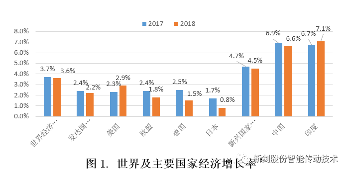 根据国际货币基金组织(IMF)2018年10月的统计数据,可以看到世界经济成长率18年比17年下降0.1%。美国的经济形式呈上升趋势。比17年上升0.6%,是因为特朗普的减税政策和积极的设备投资使经济成长呈现上升趋势。欧盟比17年下降0.6%,呈现大幅下降的趋势。主要原因是英国脱欧和中美贸易摩擦,致使欧盟各国的外需减少。德国也因汽车工业的不景气而导致第三季度负增长。中国遭遇28年以来低水准增长,因政府清理债务、减少基础设施投资和中美贸易摩擦等原因。印度2014年开始,成功实施大量招商引资的政策。比17年增长7.1%,预测今后还会保持高水准增长。从全球经济态势上看世界经济的发展正在减速。