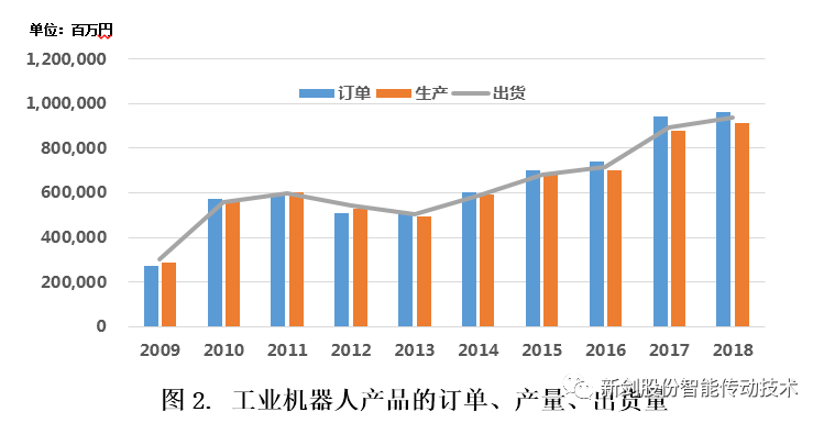 截至2019年日本机器人市场迎来了高速增长期。订单量18年比17年上升1.9%,连续6年呈增长趋势。生产量比17年上升3.9%,连续5年呈增长趋势。出货额比17年上升4.1%,连续5年呈增长趋势。依据数据可知日本2018年度订单量:9,624亿日元,约为613亿人民币,生产量:9,116亿日元,约为581亿人民币,出货额:9,360亿日元,约为596亿人民币。