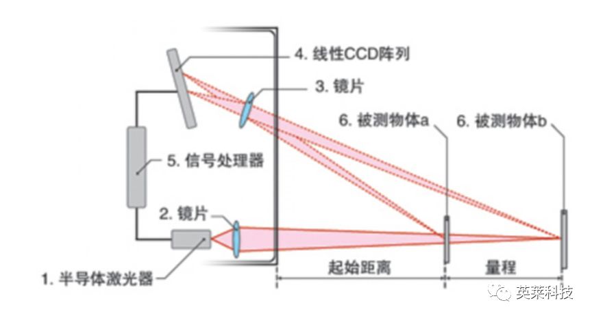 传感器中激光发射器通过镜头将可见激光射向被测物体表面,经物体反射的激光通过接收器镜头,被内部的CCD线性相机接收,根据不同的距离,CCD线性相机可以在不同的角度下“看见”这个光点。根据这个角度及已知的激光和相机之间的距离,数字信号处理器就能计算出传感器和被测物体之间的距离。